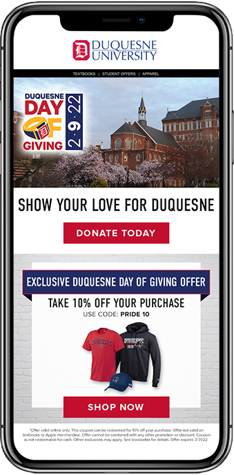 The Duquesne Office of Alumni Engagement partnered with BNC in the campus-wide effort, and we proudly participate each year, leveraging our reach with key audiences. The Duquesne bookstore prominently featured and linked to this year’s Day of Giving fundraiser on the home page and emailed our subscriber base, creating additional interest by offering a one-day discount on the bookstore site.