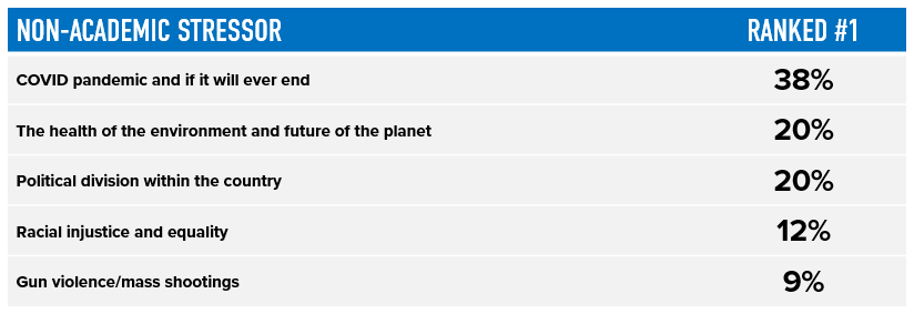 - 38 percent of students listed the COVID pandemic and if it will end as the number one stressor