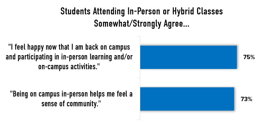 - 75 percent of students who are attending in-person or hybrid classes feel happy now that they are back on campus and participating in in-person learning and on-campus activities