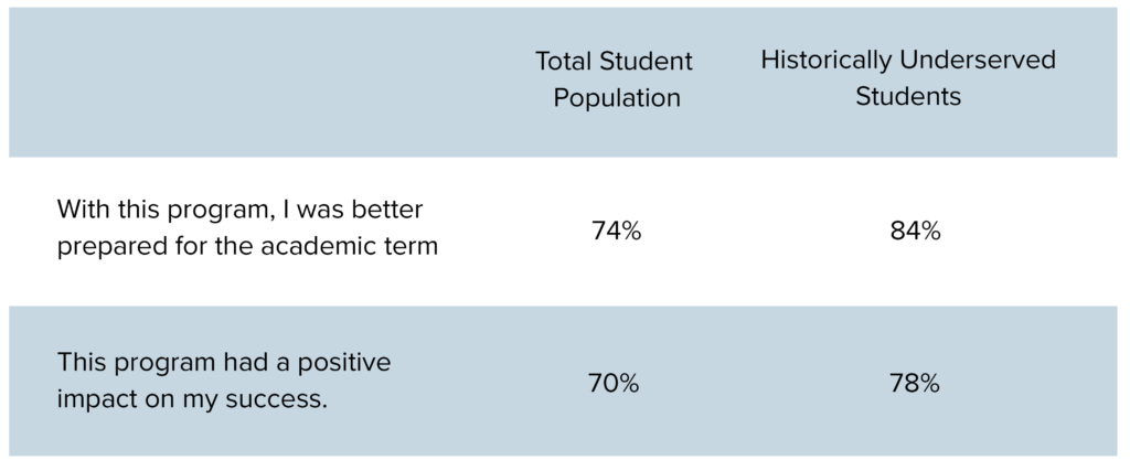After the Spring 2021 term, we surveyed students at colleges and universities nationwide about the program and its impact. Nearly two-thirds (62%) said the program helped them achieve better grades, and feedback overall was extremely positive – especially in historically underserved student populations.