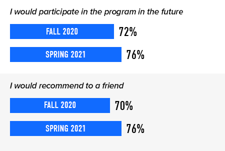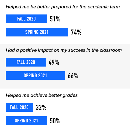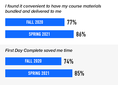 First Day® Complete is designed to support better student experiences and, ultimately, better student outcomes. In the Fall 2020 and Spring 2021 terms, we surveyed students at colleges and universities nationwide to find out what they think about the program – and the impact it’s had on them. Results started positive and have continued to improve over time.