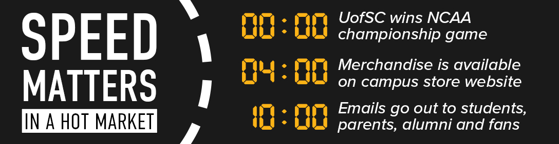 Within four minutes of UofSC’s victory, the campus store website was updated with championship merchandise, including t-shirts, hoodies, hats, tumblers, socks, flags, decals, can coolers and more. Emails went out to students, faculty, alumni and fans within 10 minutes.