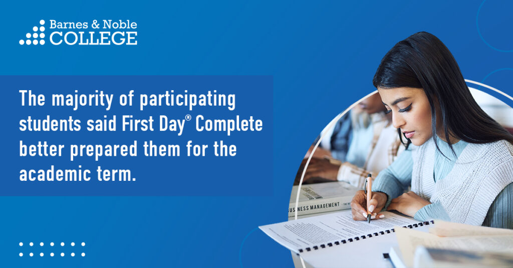 Students are looking for easier, more convenient and affordable ways to navigate their academic journey. First Day® Complete makes it simple for them to get access to their course materials before the first day of class. In our Spring 2024 First Day Complete Experience Survey, respondents cited ease and convenience, lower stress and affordability as reasons they would recommend the program to other students. The majority of participating students also said First Day Complete better prepared them for the academic term.