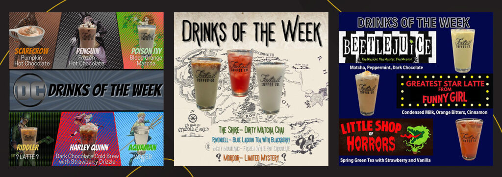 Each week, the café employees create coffee and tea “drinks of the week” specific to each Trivia Night theme – either renaming existing menu items or inventing brand-new options. The store team promotes the drinks in store and on social media, driving sales on Wednesday nights and beyond. Customers stop by throughout the week specifically to try the themed specials.