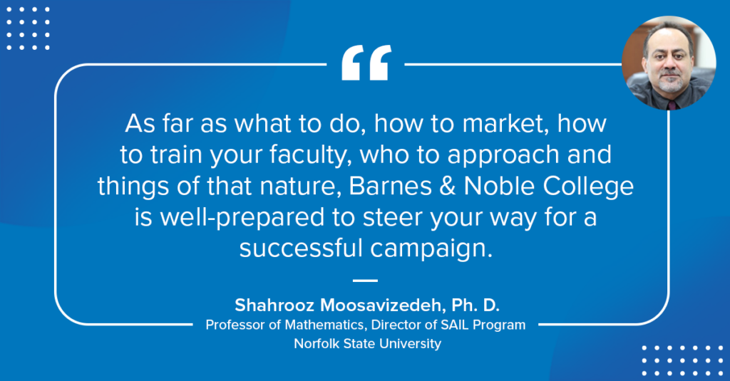 “And I like to add that Barnes & Noble College was a huge help. This plan, this program is well organized. And I mentioned about PowerPoints, I mentioned about QA, and I mentioned about training. All those PowerPoint slides, QAs, if you will, they were all provided by Barnes & Noble College. We met regularly for a few months, actually weekly meetings that we had. So as far as what to do, how to market, how to train your faculty, who to approach and things of that nature, Barnes & Noble College is well-prepared to steer your way for a successful campaign.”